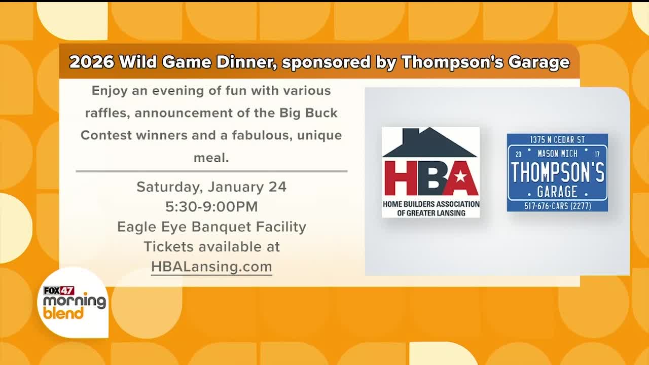 LANSING, Mich. — The 2026 Wild Game Dinner, sponsored by Thompson's Garage is Saturday, January 24th at Eagle Eye Banquet Facility. Enjoy an evening of fun with gun raffles, prize table raffles, cash raffles, the announcement of the Big Buck Contest winners and a fabulous, unique meal. Tickets can be purchased at HBALansing.com.